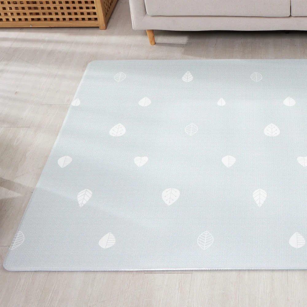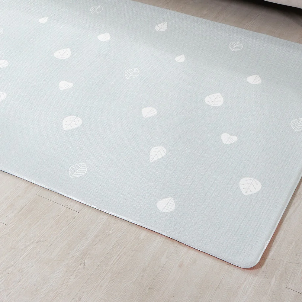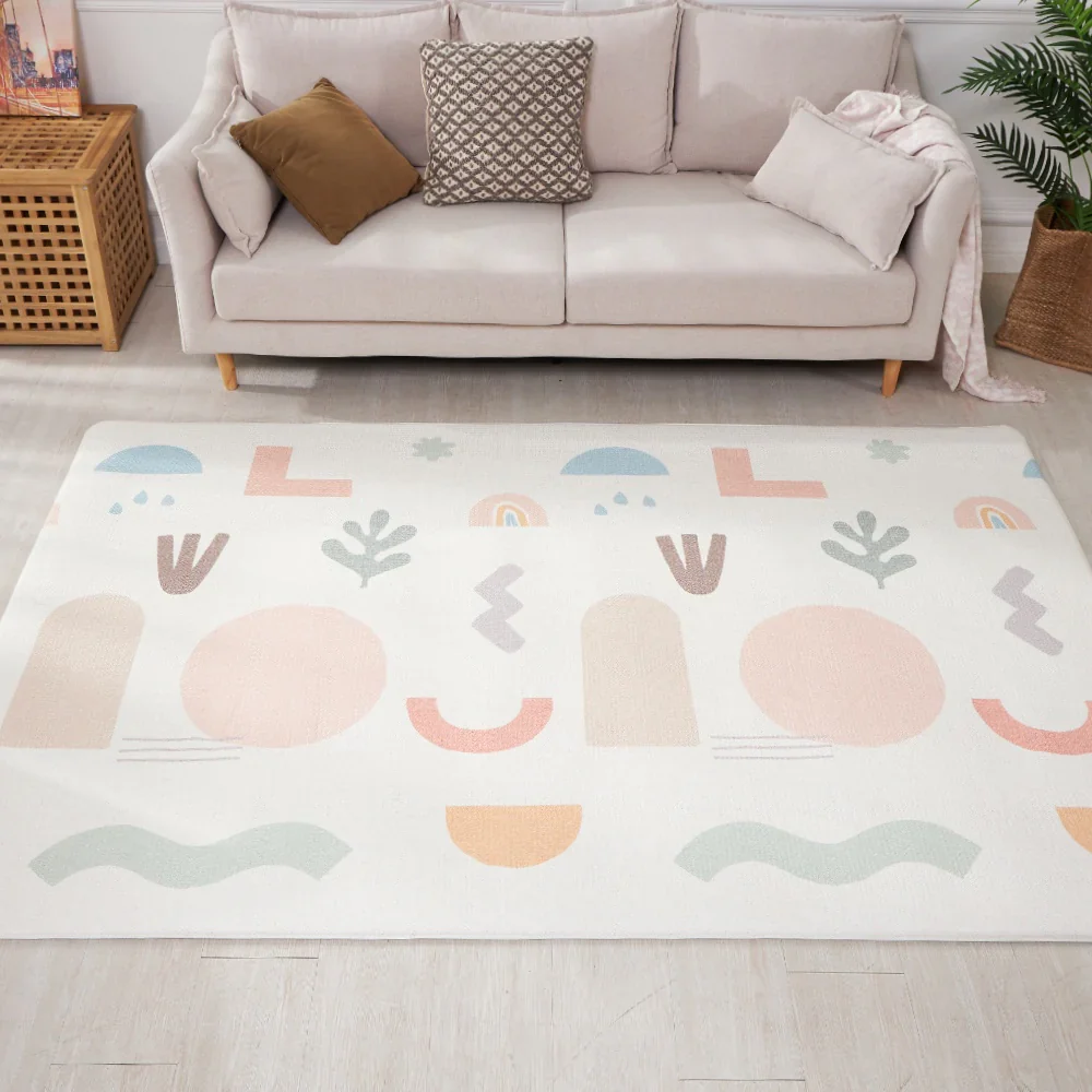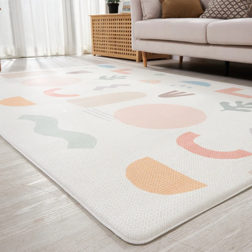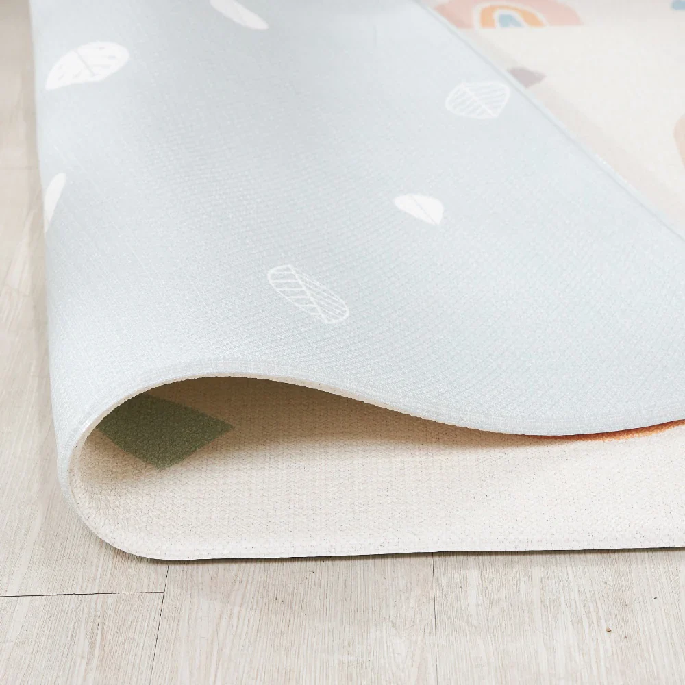 Uno de los favoritos! Fondo beige con entretenidas y decorativas figuras en colores pastel que invitan a jugar en familia. Simula un desierto muy colorido. Por el otro lado, un fondo en color menta suave con un toque único de pequeñas hojas blancas.