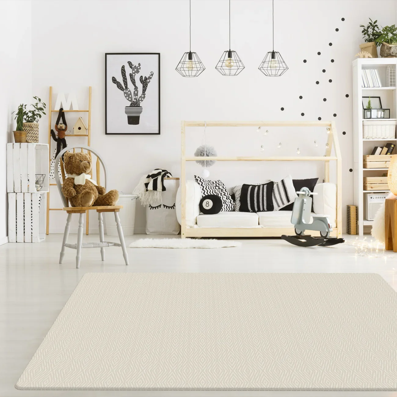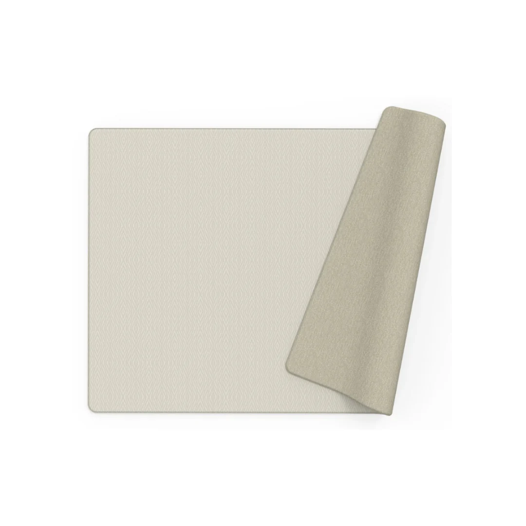 – Lado A: Fondo beige claro con pequeños diamantes blancos que recrean el diseño de una alfombra tejida con un toque moderno y acogedor.