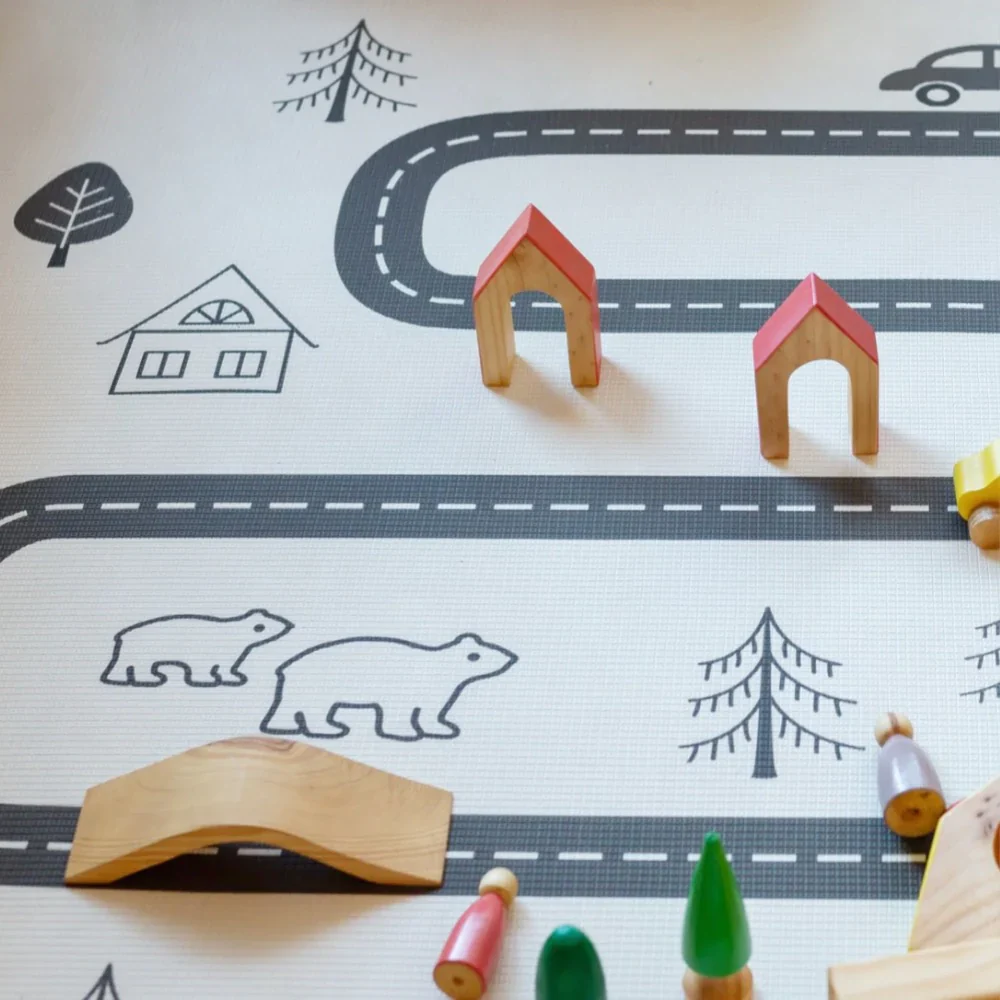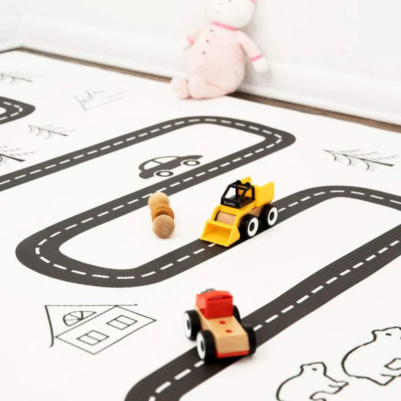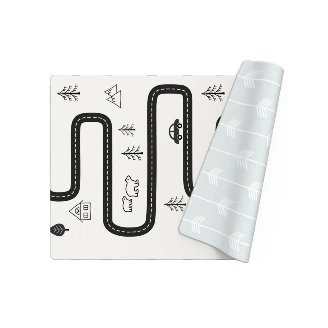 Uno de los diseños favoritos de Oruga Kids. Diseño Nórdico con líneas y flechas en tonos muy claros. Por el otro lado, una pista con una ciudad para dejar jugar a la imaginación.