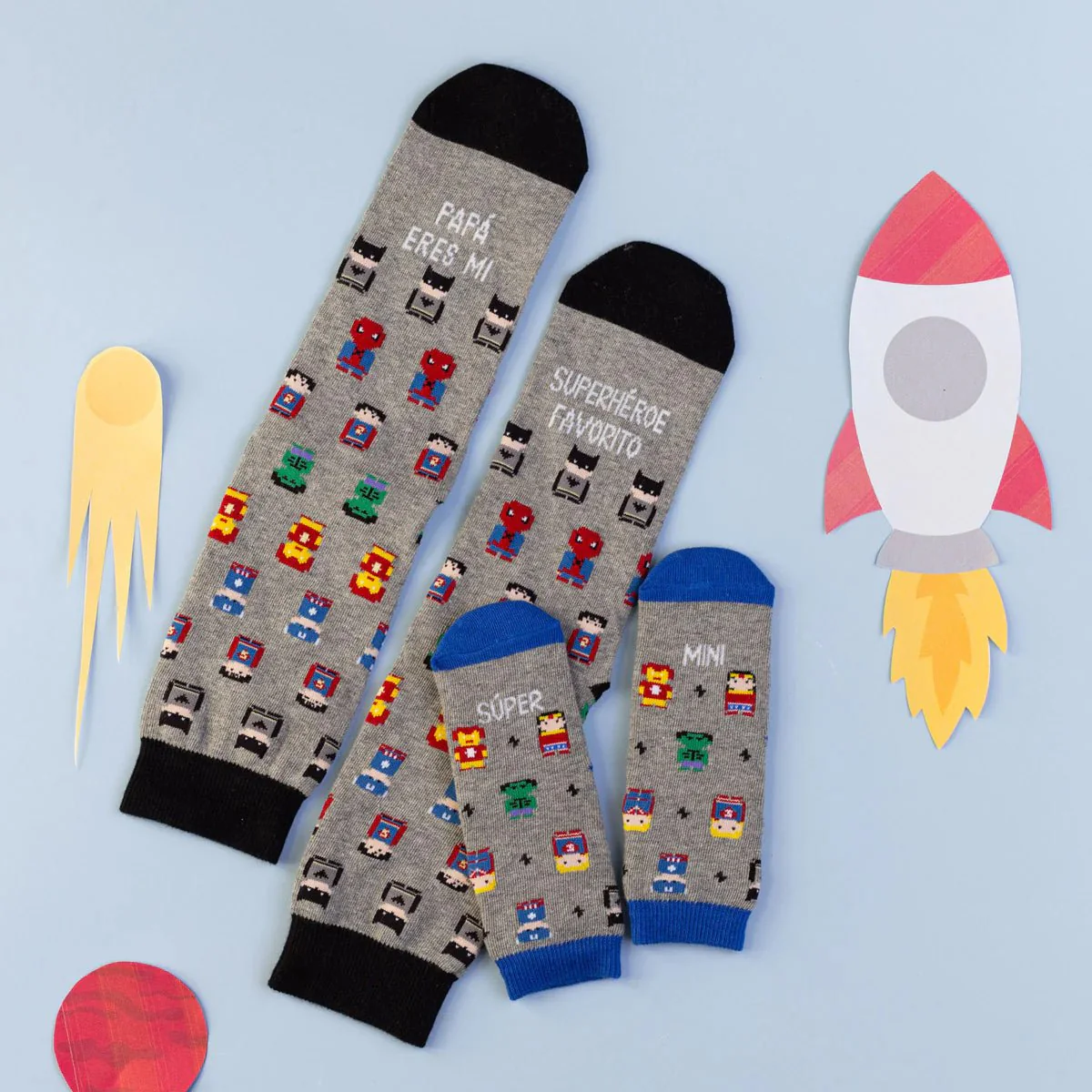 Esos papás que son superhéroes se merecen estos calcetines que se lo recuerden siempre. Por lanzarl@s por los aires, saber cómo están con solo mirarl@s, ser expertos en cosquillas y en narración de cuentos sin descanso. ¡Ni los de las pelis!