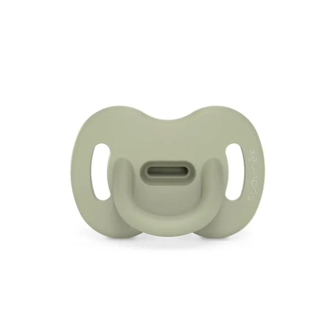 • Tetina Plana, Simétrica y Reversible: El diseño de la tetina permite colocar el chupete en cualquier dirección, facilitando que el bebé pueda cerrar la boca casi completamente y brindándole más espacio para que la lengua repose de manera natural.