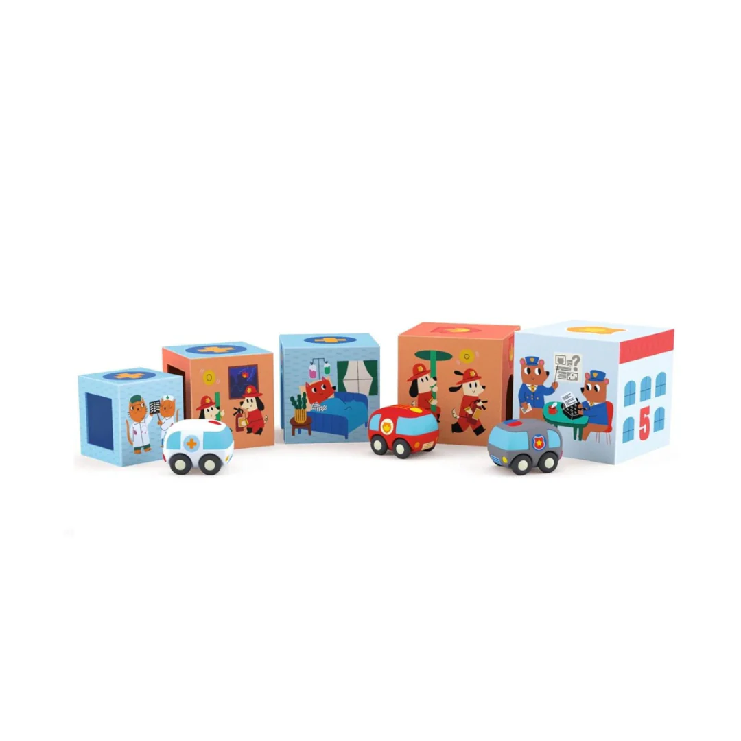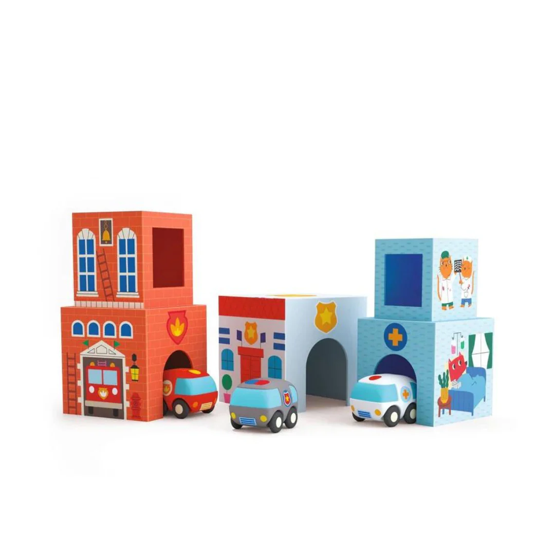 - Material: Cubos de cartón, Autos de plástico