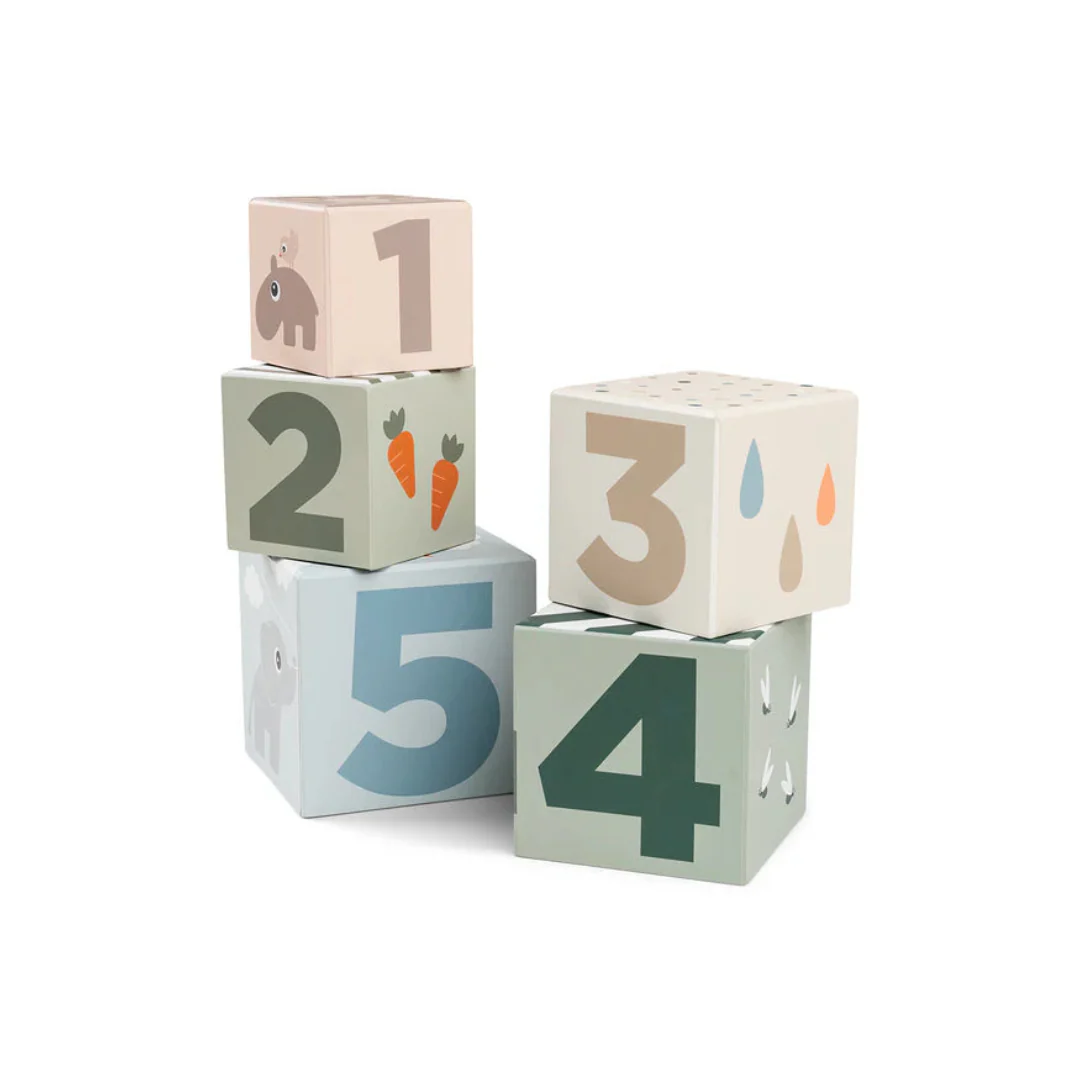 Diviértete con nuestro juego de 5 cubos apilables, decorados con una encantadora combinación de colores suaves. Estos cubos ofrecen un entretenimiento sin fin: deja que tu hijo los apile, los dé vuelta o incluso esconda pequeños tesoros en su interior.