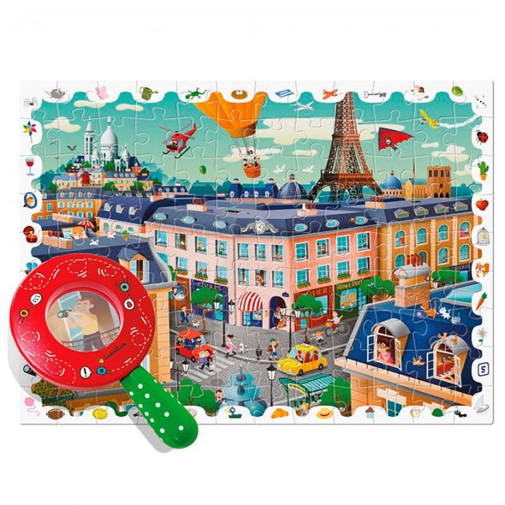 Monta el puzle y diviértete buscando con la lupa de madera un montón de objetos escondidos en la ciudad. La imagen de este puzle se ha diseñado específicamente para desarrollar la capacidad de atención y de observación y es apta para grandes y pequeños.