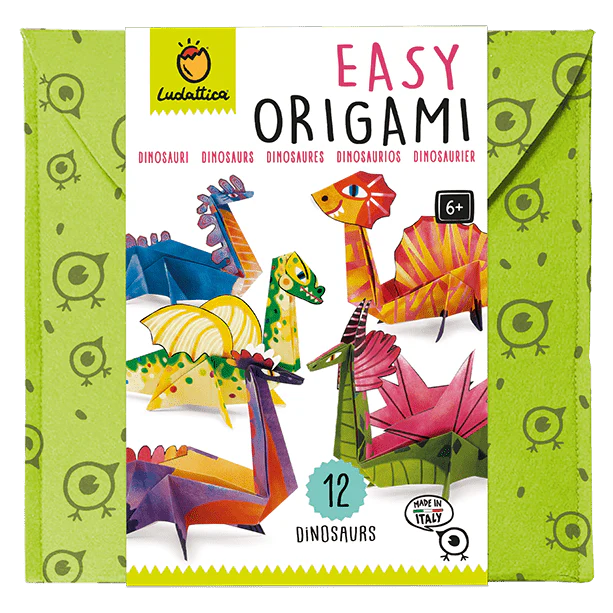 12 originales dinosaurios de papel, todos diferentes, que doblar para experimentar de una manera sencilla el antiguo arte de los origamis. ¡Un juego educativo, creativo y realmente divertido! El envoltorio del juego, de suave paño, se convierte en una bolsa contenedor para conservar y reutilizar.