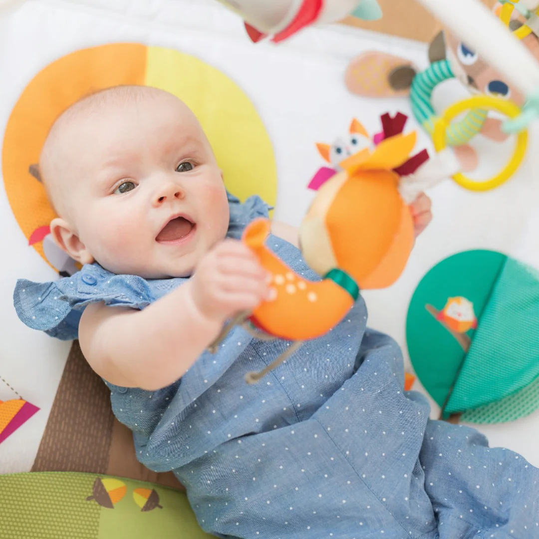 Sus diferentes modos de uso permiten que el bebé disfrute mientras está acostado, fortaleciendo sus habilidades motoras cuando juega boca abajo, explorando juguetes al sentarse o simplemente cambiando la disposición de los arcos para descubrir nuevas perspectivas. Con muñecos suaves, texturas variadas y un espejo pensado para estimular el tiempo boca abajo, cada detalle está diseñado para favorecer el desarrollo visual, cognitivo y motriz.