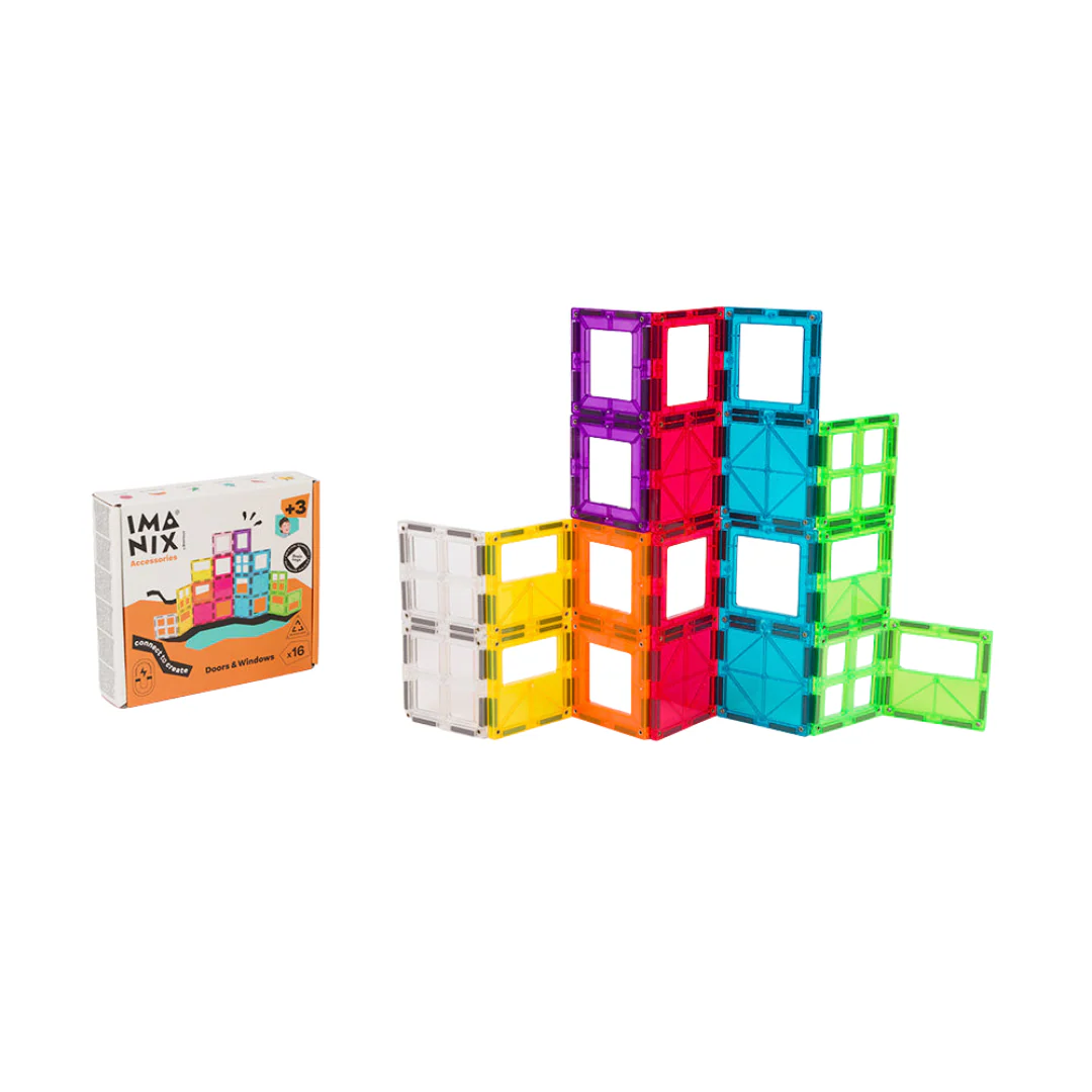 - Set completo: Incluye 16 piezas entre puertas y ventanas, diseñadas para integrarse a la perfección con todos los sets de construcción magnética IMANIX.