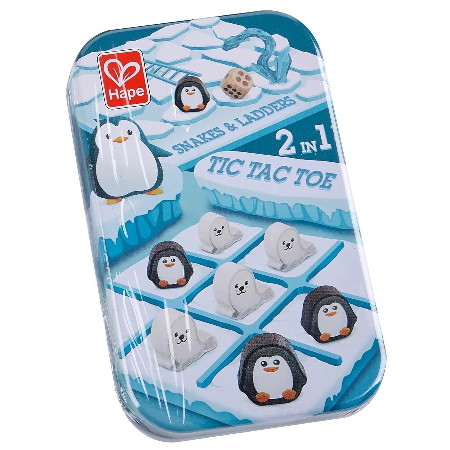 ¡Disfruta de la diversión clásica en cualquier lugar con el juego de bolsillo 2 en 1 de Hape: Tres en Raya y Serpientes y Escaleras! Este set portátil reúne dos de los juegos más queridos en un formato compacto, perfecto para llevar de viaje o jugar en cualquier momento. Con tableros plegables resistentes y fichas de madera en forma de pingüinos y focas, tu peque se sumergirá en horas de entretenimiento mientras desarrolla su pensamiento estratégico y toma de decisiones.