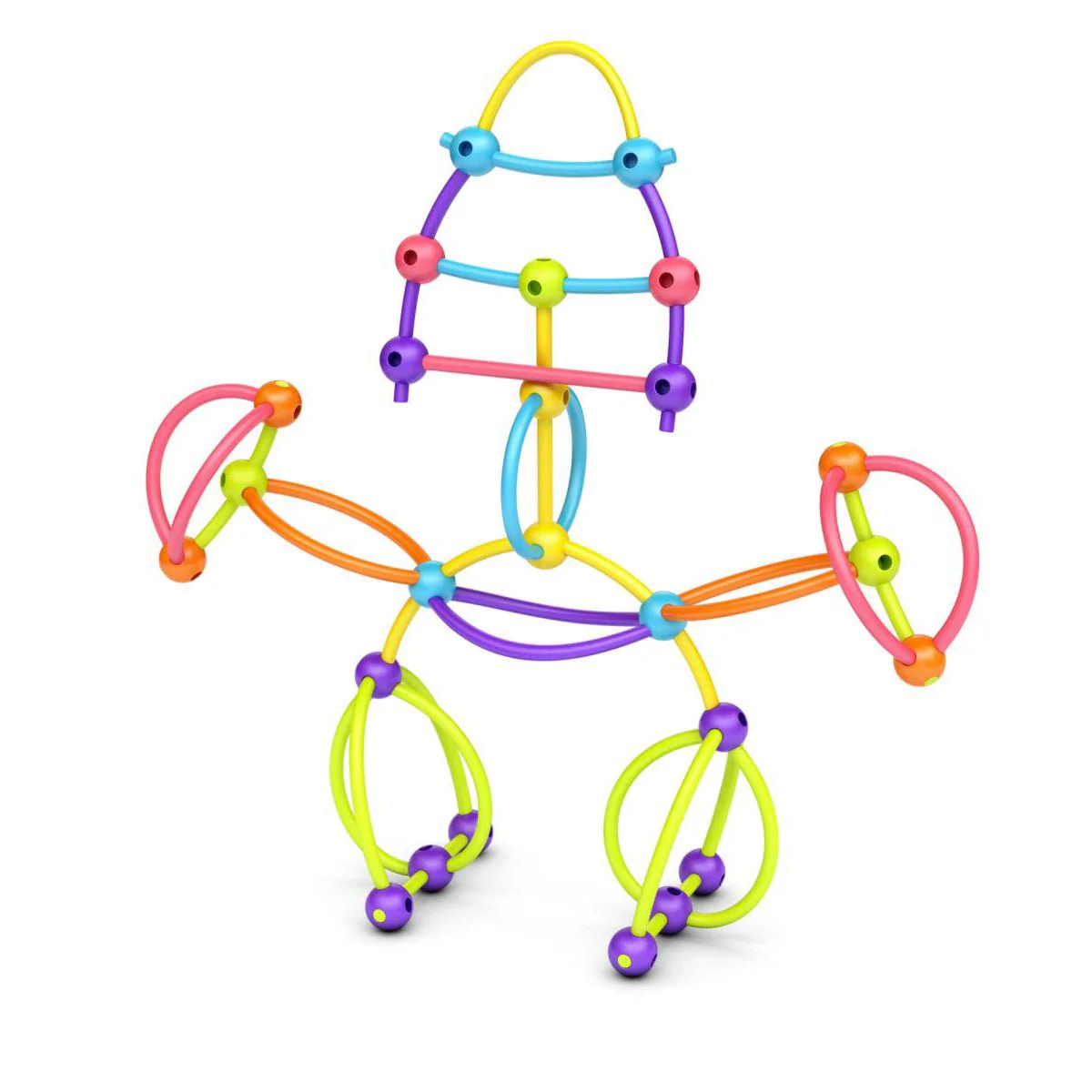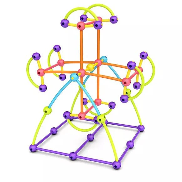 Sus elementos muy sencillos -palitos flexibles y canicas con agujeros- están fabricados en plástico blando y son 100% seguros para sus manos pequeñas y ágiles. Gracias a sus vivos colores, incluso los niños más pequeños están deseando jugar con estos intrigantes bloques para construir todo lo que puedan imaginar.