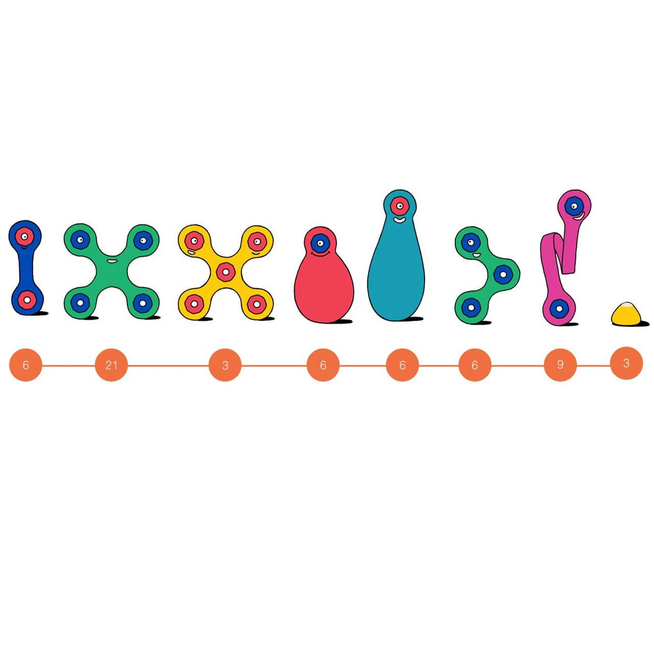 - Piezas: 60 piezas en 8 formas distintas, incluyendo 21 quads y 3 spinners.