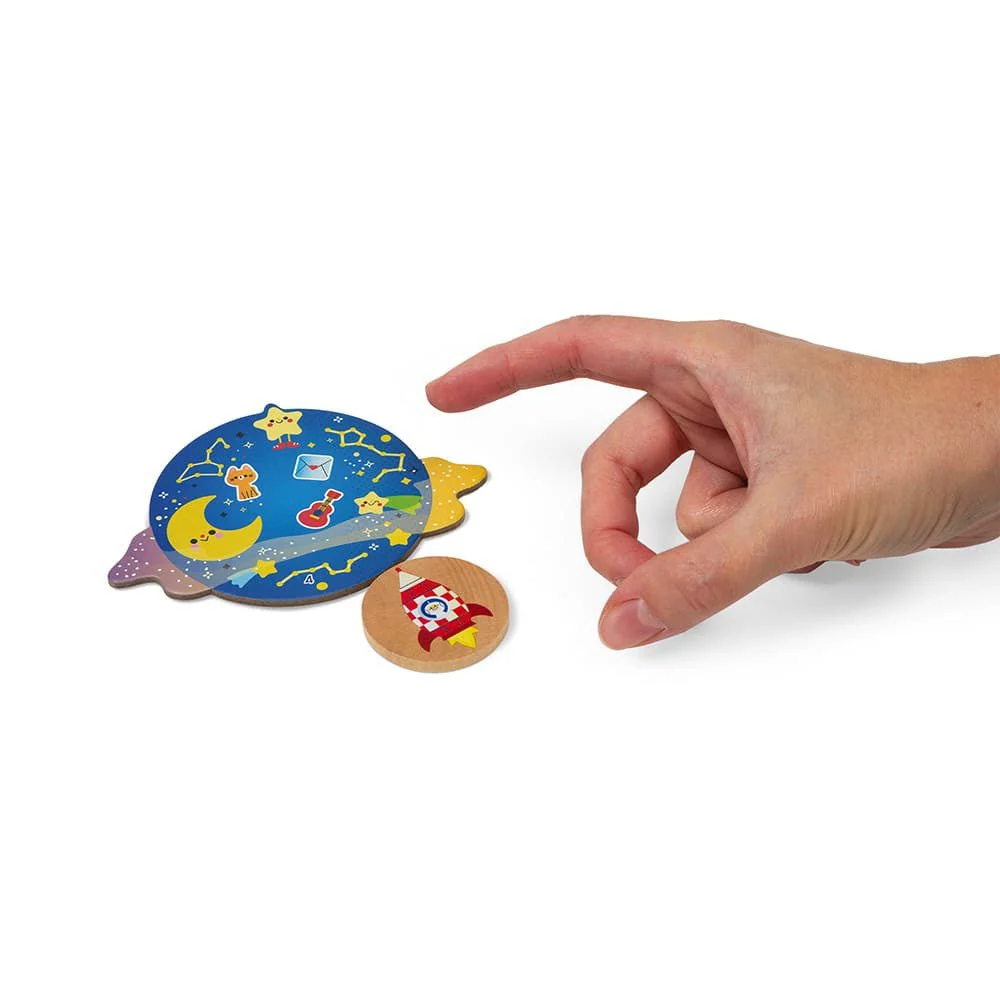 Los capirotazos no sirven solo para las canicas: ¡también son muy útiles para enviar mercancías de un planeta a otro! Este juego de habilidad para niños a partir de 4 años tiene varios niveles de dificultad para ir complicando las partidas a medida que se conoce el juego. Todos los cohetes parten desde la plataforma de lanzamiento con el objetivo de alcanzar el planeta que espera su cargamento. Pero cuidado porque, una vez abastecido el planeta, los demás jugadores ya no podrán enviar allí ese mismo objeto. Este juego de paciencia es perfecto para desarrollar la concentración de los niños, que tendrán que perseverar para entregar con éxito todos sus artículos a golpe de capirotazo evitando el agujero negro.