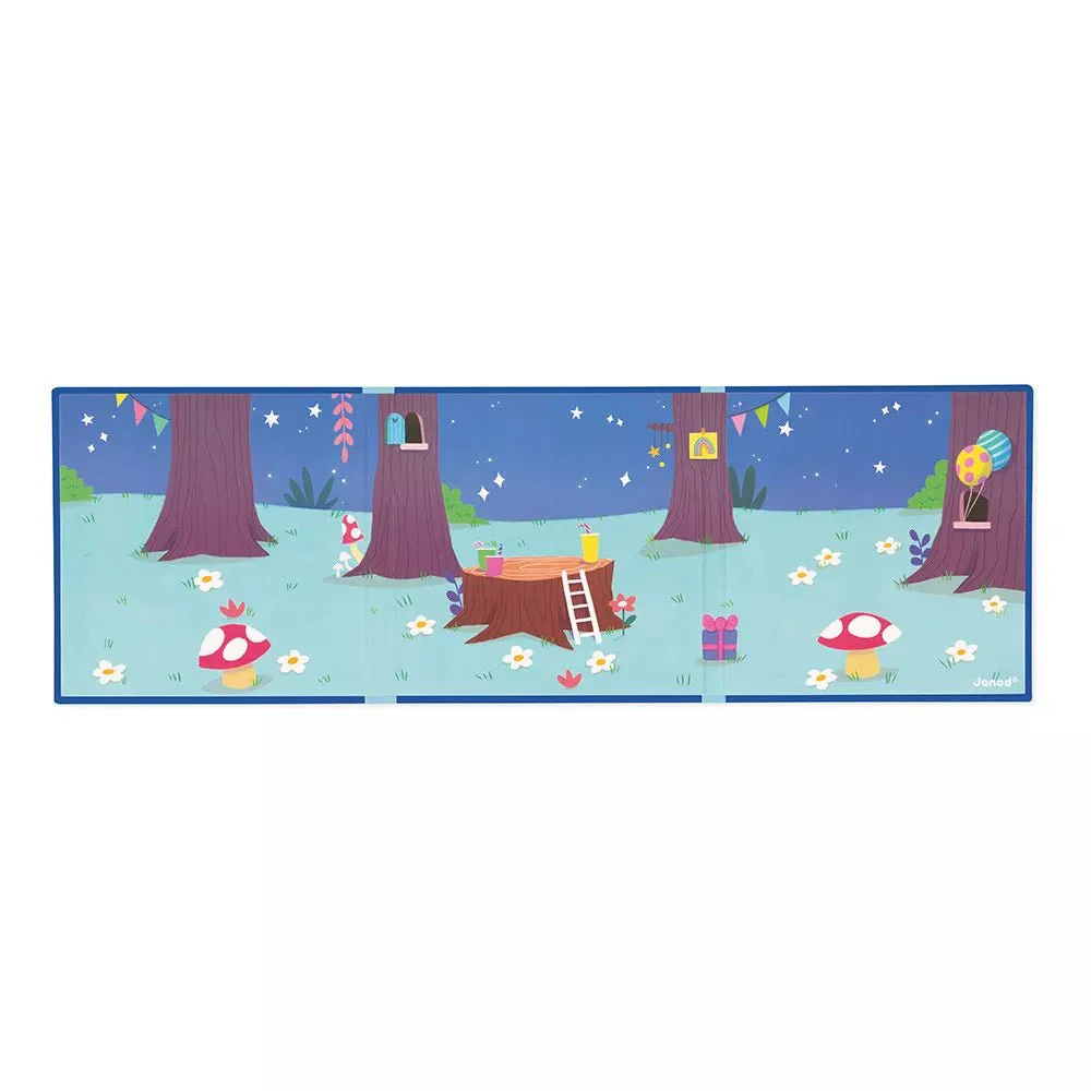 ¡Ven, corre! Acaba de caer la noche en el bosque y hay una gran sorpresa. Este juego magnético sorprenderá a los niños a partir de 3 años. Este decorado ilustrado estimulará la imaginación y la motricidad fina del pequeño. Este juego magnético consta de un tablero decorado grande y 30 imanes.