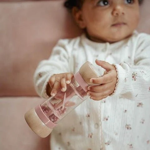 ¡Agitar y traquetear! Da la vuelta al sonajero palo de lluvia y las bolas se moverán hacia el otro lado haciendo sonidos relajantes de gotas de lluvia. Estimulará el desarrollo sensorial y el talento musical del bebé. Las bolas de 3 colores diferentes caen por el tubo a través de pequeñas aberturas y hacen girar la hélice, lo que produce un sonido agradable. El sonajero palo de lluvia está diseñado para manos pequeñas y es fácil de agarrar. La tapa y el fondo de madera están ilustrados con una flor y una mariposa de la colección Flowers & Butterflies.