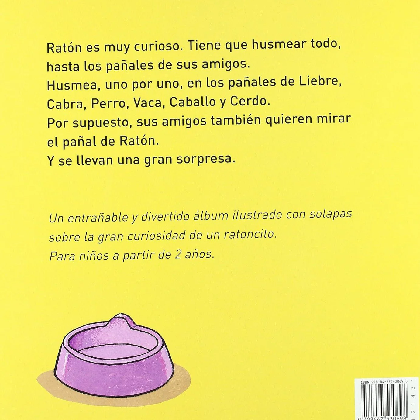 Ratón es muy curioso. Tiene que husmear todo, hasta los pañales de sus amigos. Husmea, uno por uno, en los pañales de Liebre, Cabra, Perro, Vaca, Caballo y Cerdo. Por supuesto, sus amigos también quieren mirar el pañal de Ratón. Y se llevan una gran sorpresa.