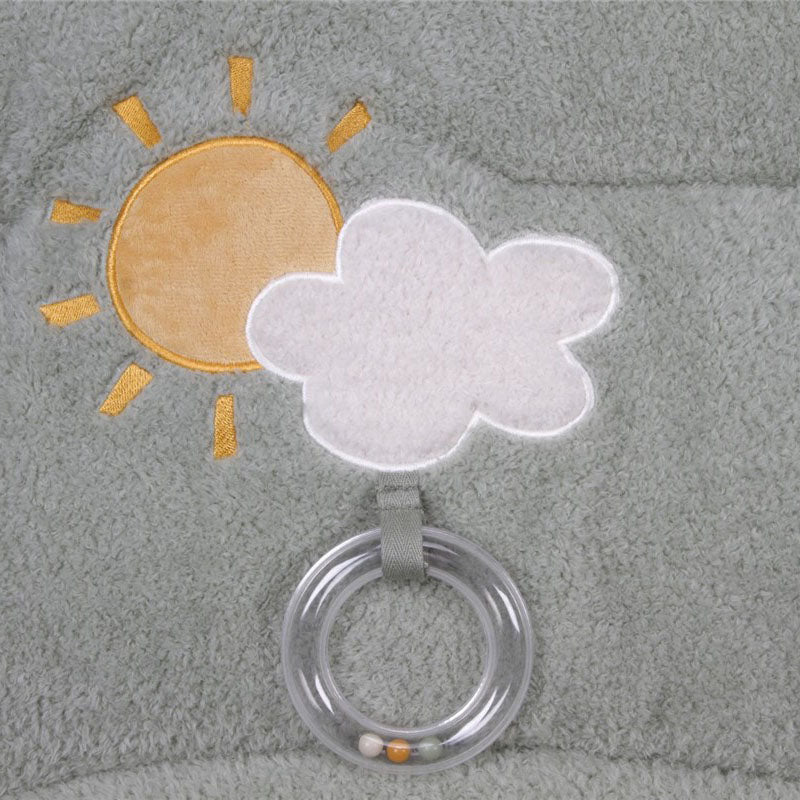 Hay mucho por descubrir ¡y ver! Las alitas de la gallina hacen un sonido crujiente, y puedes descubrir lo que se esconde debajo de ellas. Las nubes tienen una suave tela de peluche y hay varias etiquetas por descubrir. También hay un anillo de dentición adjunto.