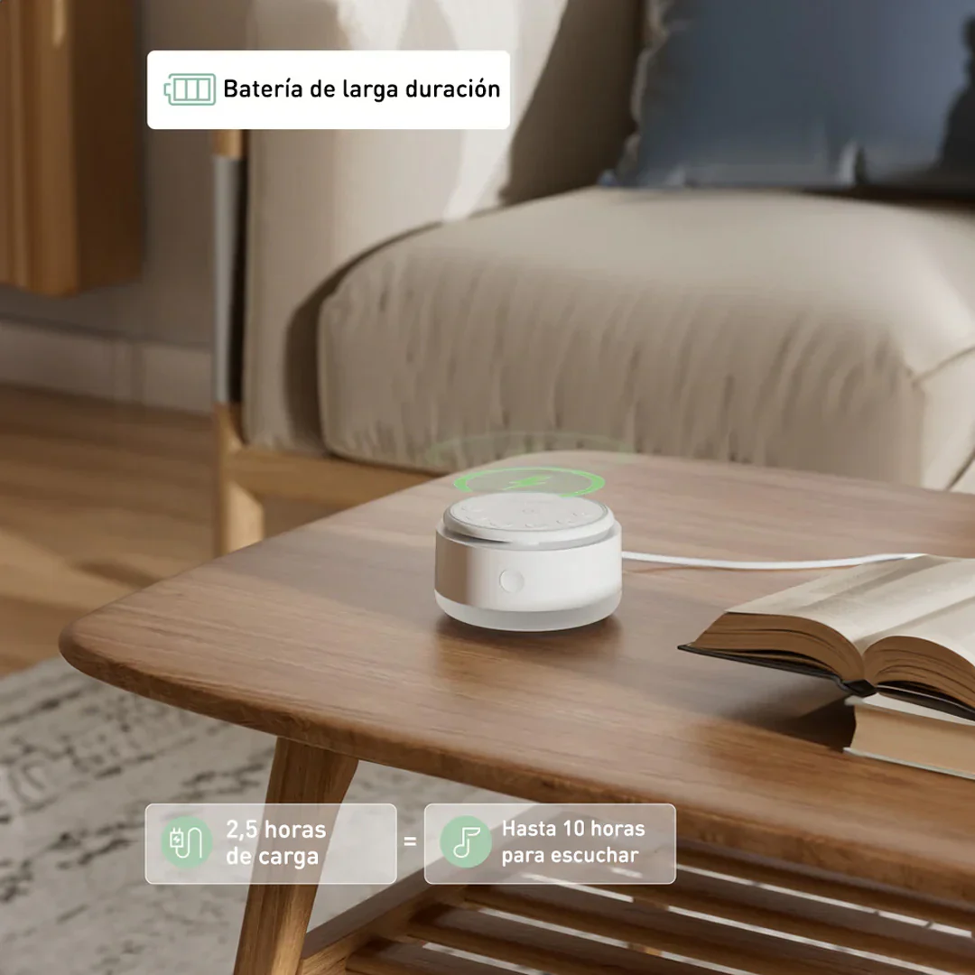 Incluye ruido blanco, olas, lluvia y canto de pájaros, ideales para dormir, meditar o concentrarse.