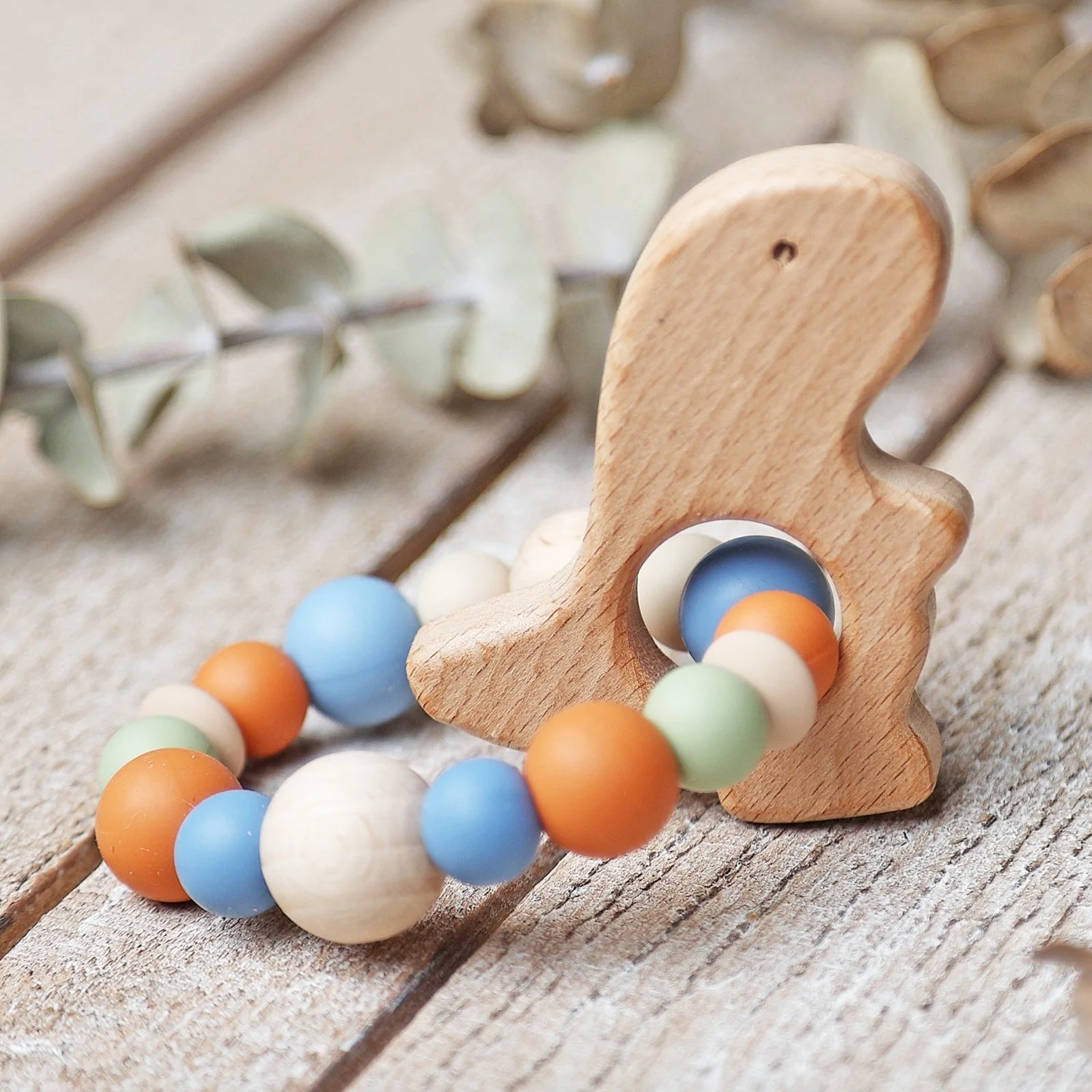 Este pack incluye un chupetero con el nombre del bebé, un mordedor de mano y un mordedor de carrito con figura de silicona. Las piezas son seguras para los más pequeños, ya que están fabricadas con silicona de grado alimentario libre de BPA, PVC, ftalatos y metales pesados y madera de haya natural sin tratar.