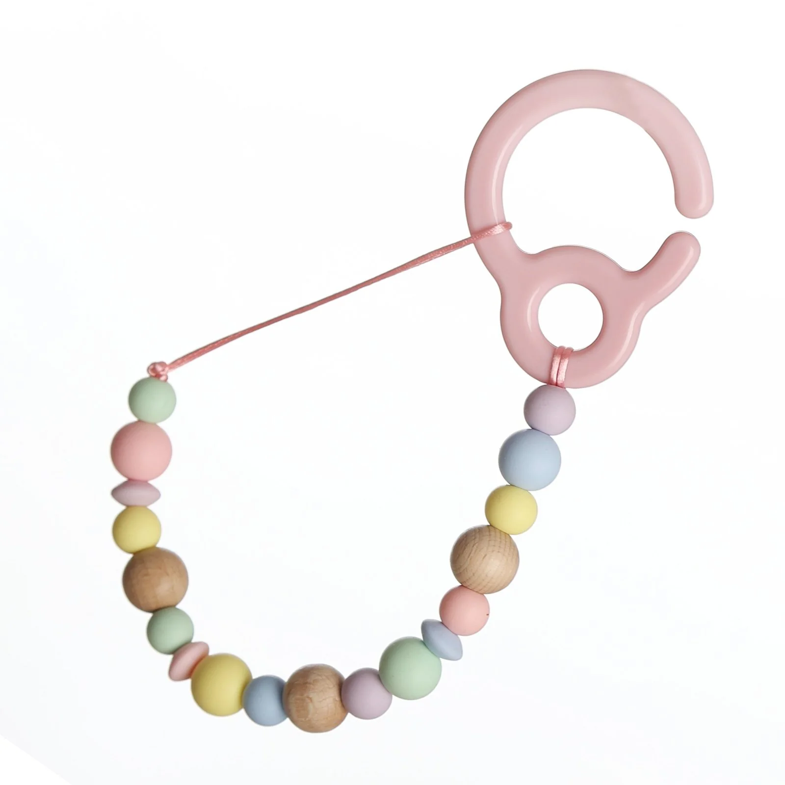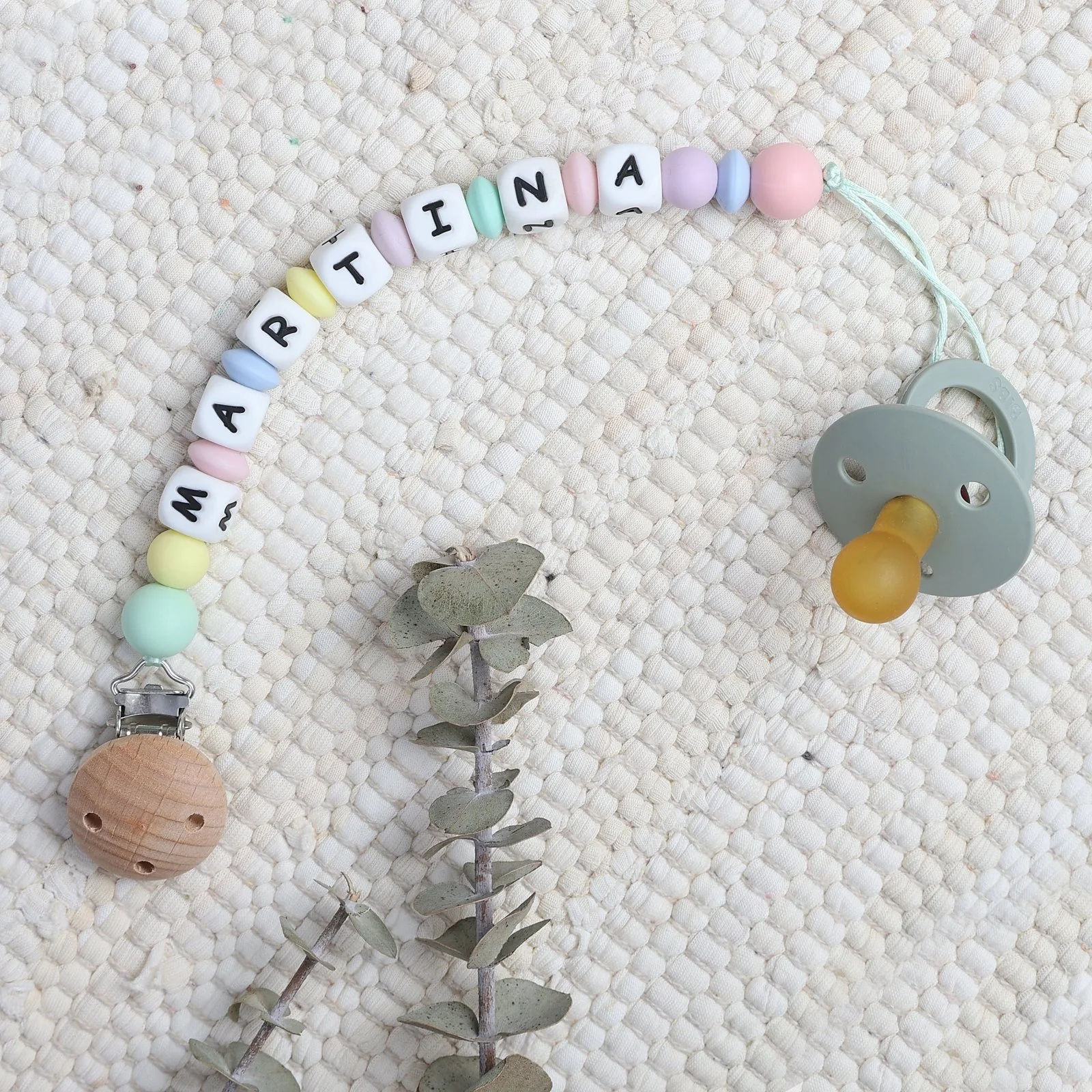 Las piezas de este pack están fabricadas con silicona de grado alimentario libre de BPA, PVC, ftalatos y metales pesados, y las piezas de madera son de haya natural sin tratar. El cordón es de satén, resistente, bonito y agradable al tacto. Tenemos disponible la letra Ñ, pero no tenemos tildes ni caracteres especiales. El chupetero no puede superar los 22cm por motivos de seguridad (sin contar el clip), por lo que si el nombre del bebé es muy largo, se adaptará el número de piezas para cumplir con esta longitud.