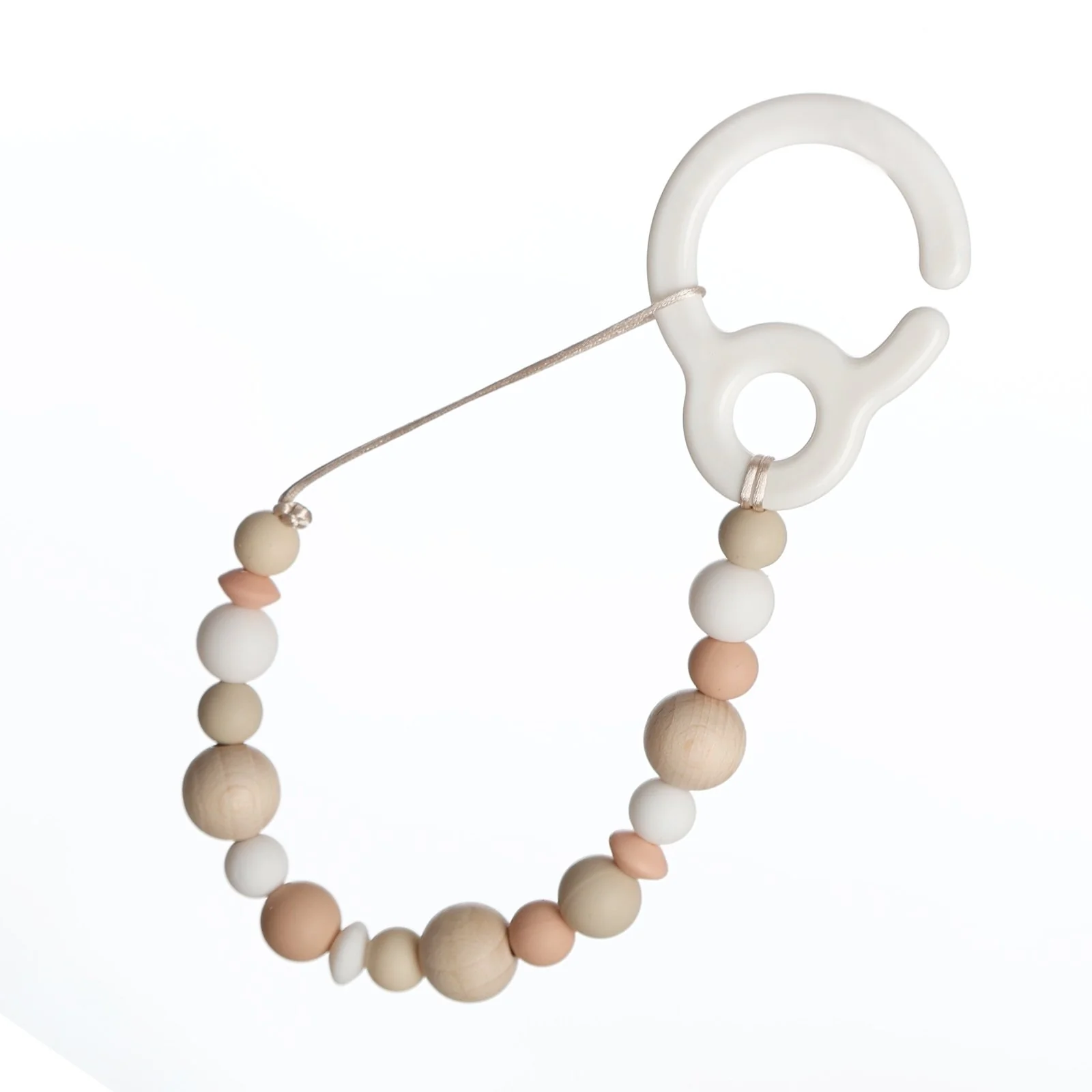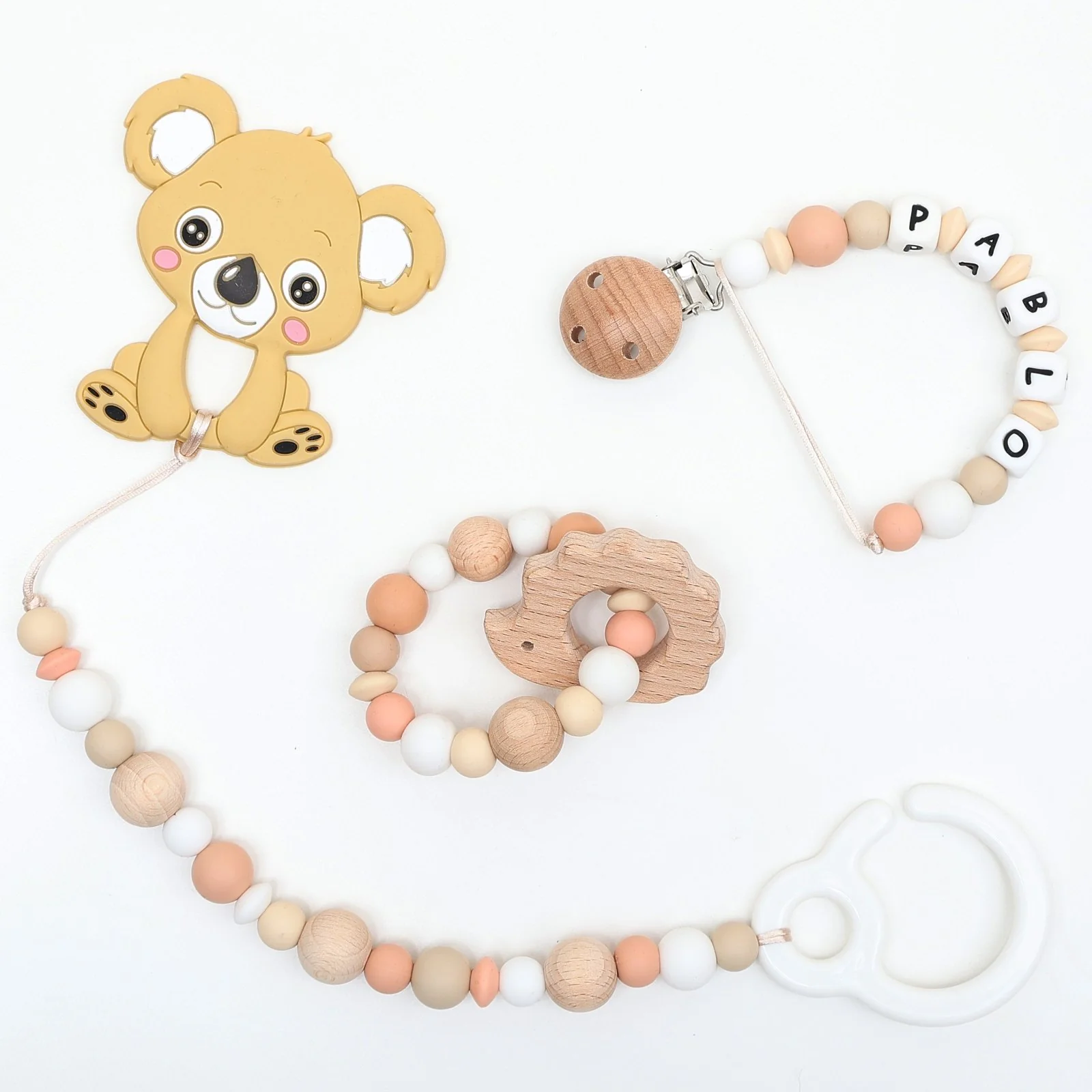 Este pack incluye un chupetero con el nombre del bebé, un mordedor de mano y un mordedor de carrito con figura de silicona. Las piezas son seguras para los más pequeños, ya que están fabricadas con silicona de grado alimentario libre de BPA, PVC, ftalatos y metales pesados y madera de haya natural sin tratar.