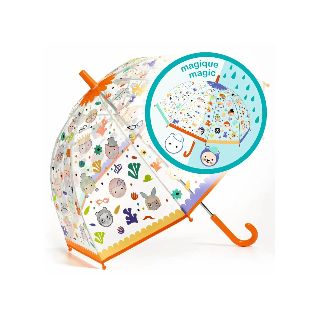 Este paraguas con diseños de caras transparentes alegrará cualquier día lluvioso. Las áreas blancas del paraguas cambian de color mágicamente al contacto con la lluvia, y vuelven a su color original al secarse, ¡un espectáculo que tus hijos amarán ver una y otra vez!