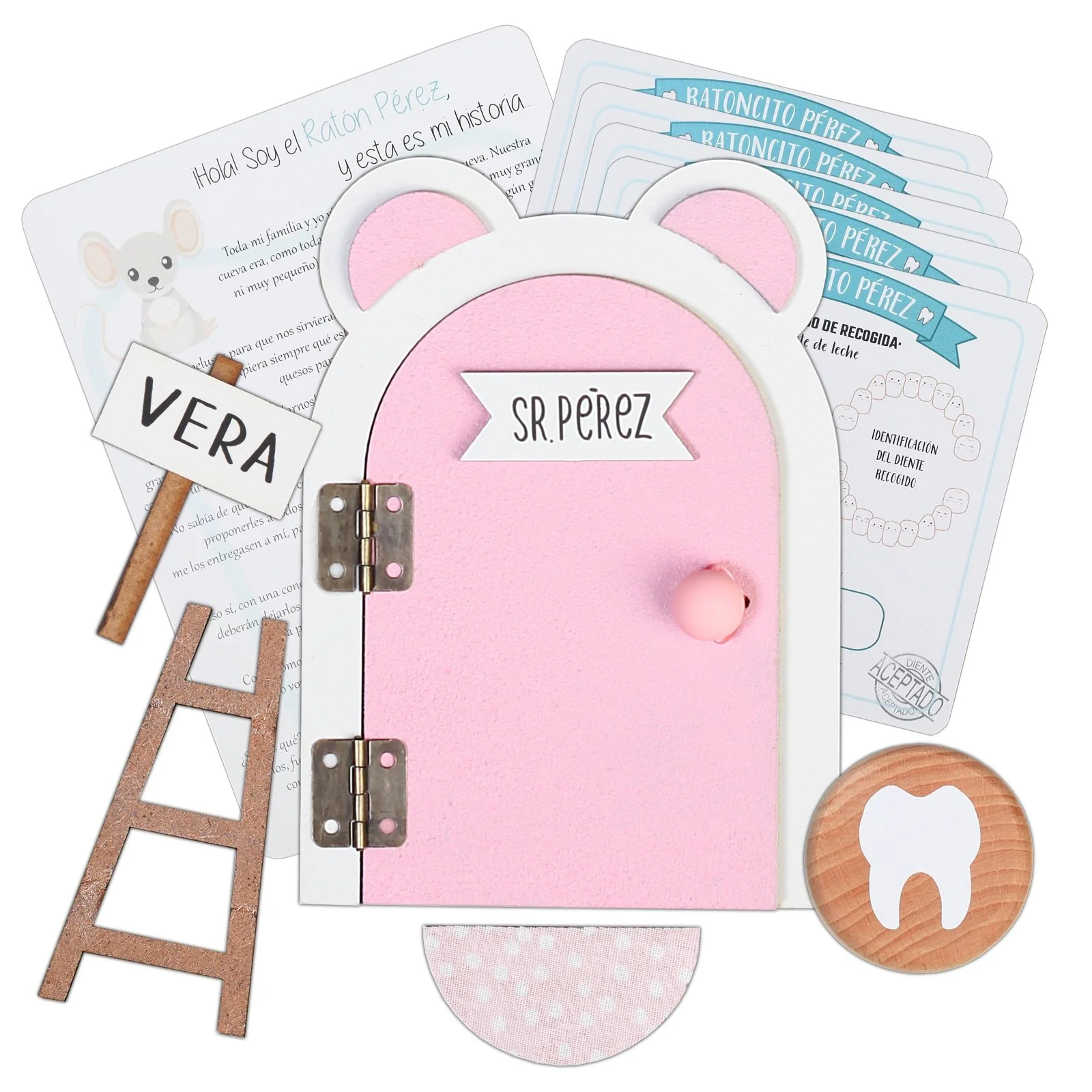 El letrero es personalizable con el nombre de tu peque, y la puerta se abre para mostrar el «camino secreto» que recorrerá Pérez. Además, el kit incluye una cajita de madera para guardar el diente, 5 certificados de recogida y una historia con valores educativos sobre la importancia de cuidar los dientes. Ideal para crear una tradición familiar llena de emoción y ternura.