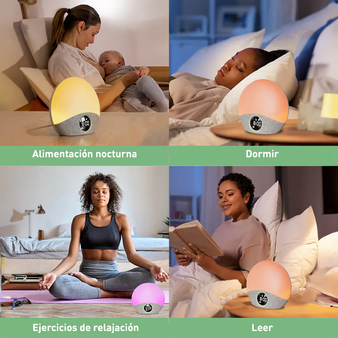 - Función 4 en 1: Alarma con luz de amanecer, reloj digital, luz nocturna y máquina de sonido.