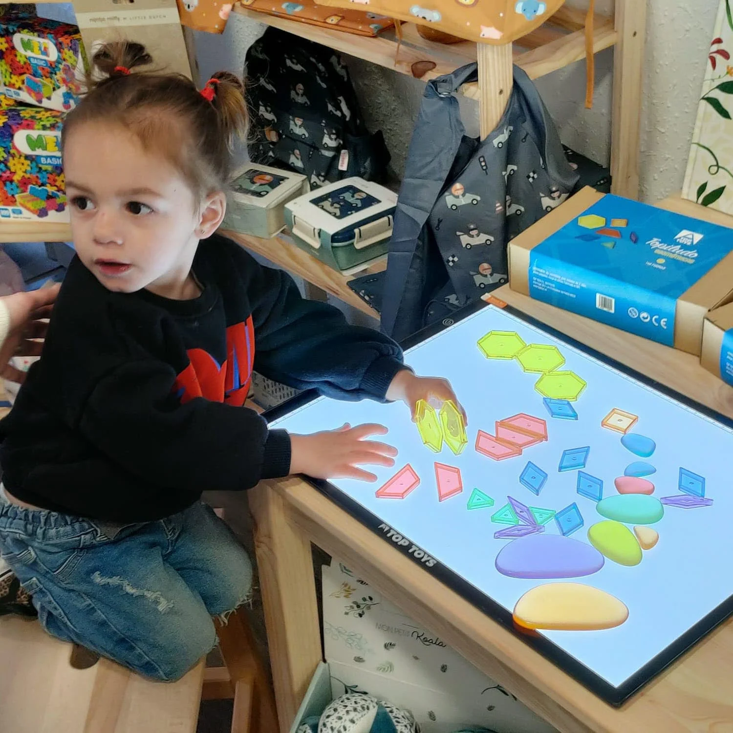 Topiludo es una colección de elementos traslúcidos creados por TOP TOYS para fomentar el aprendizaje en la mesa de luz.