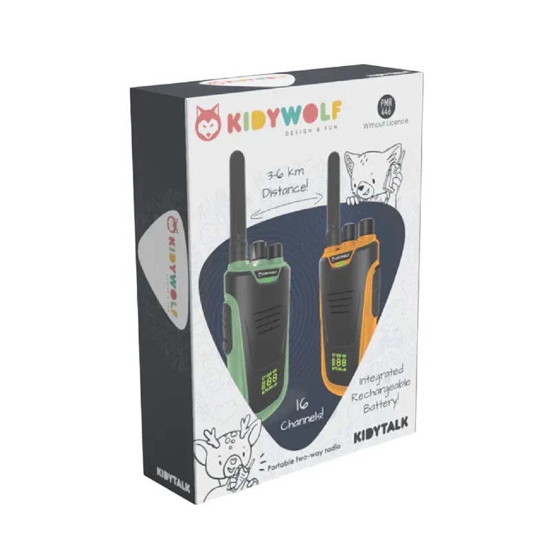 Con los Walkie Talkies Verde y Naranja de Kidywolf, niños y adultos pueden mantenerse conectados hasta a 6 km de distancia, ya sea en el jardín, durante una caminata o jugando en casa. Perfectos para juegos de espías, misiones secretas o simplemente para estar en contacto sin pantallas.